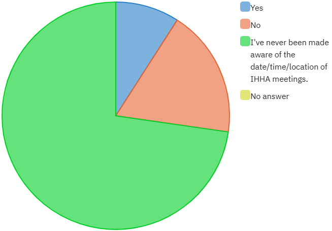 You can’t attend a meeting, even if you wanted to. When respondents were asked if they’ve ever attended an IHHA meeting, 91% have not, while 73% have never even been made aware of the dates and times or locations of meetings.