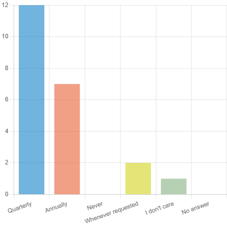 The majority of respondents, 55%, feel like meeting minutes or financial reports should be published quarterly.