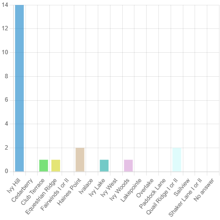 The majority of the responses were from Ivy Hill proper, but we also received responses from Club Terrace, Equestrian Ridge, Haines Point, Ivy Lake, Ivy Woods, and Quail Ridge.