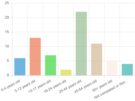 The survey results indicate that our neighborhood is primarily composed of families and established adults. The high frequency of residents in the 25–44 and 5–12 age brackets suggests a community with many school-aged children.